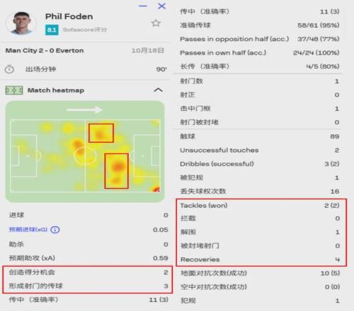 跟哈兰德的数据爆表相比,福登的进球和助攻数都不显眼,不过他本赛季的作用却是很大。以上一轮与埃弗顿的英超联赛为例,虽然没有收获助攻,但是福登送出3次关键传球,创造2次绝佳得分机会,3次过人尝试成功2次。