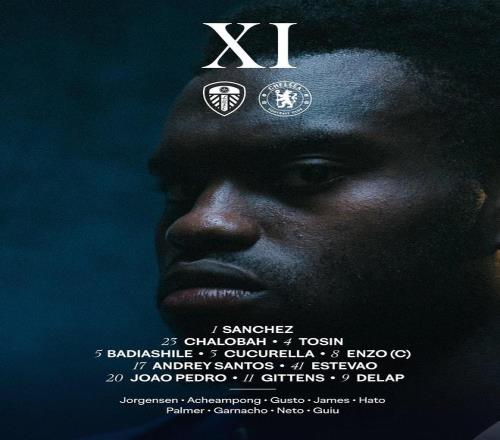 切尔西首发:1-罗伯特-桑切斯、5-巴迪亚西勒、23-特雷沃-查洛巴、3-库库雷利亚、4-阿达拉比奥尤、17-安德雷-桑托斯、8-恩佐-费尔南德斯、41-埃斯特旺、11-比诺埃-吉滕斯、9-德拉普、20-若昂-佩德罗