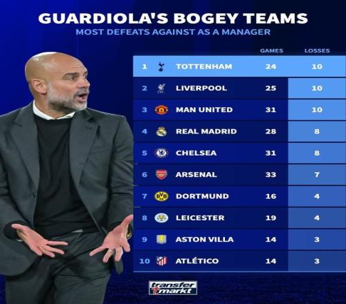 北京时间2月1日,在曼城即将做客挑战托特纳姆热刺的情况下,来自德转的统计指出,热刺是瓜迪奥拉教练生涯至今输球场次最多的对手。此前这位西班牙教头曾率队24次与热刺交手,最终吃到了10场败仗。