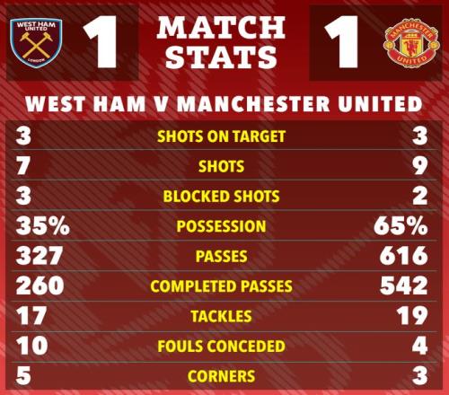 努诺·桑托的西汉姆采用541阵型密集防守,曼联掌控球权,但似乎不知道如何是好,高达65%的控球率,卡里克的球队只转化为3次有效射门。