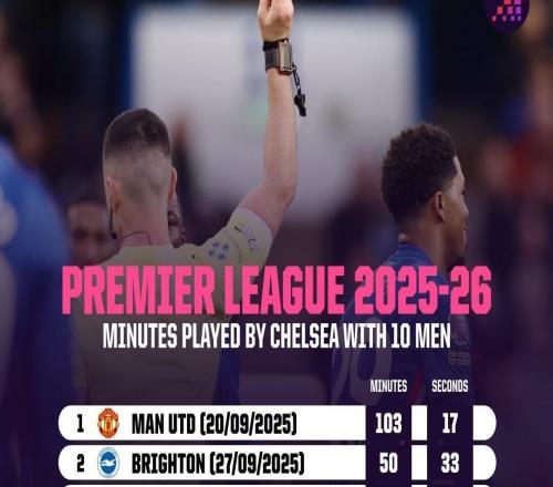 由于本赛季领到了6张红牌,切尔西在英超联赛中十人作战累计时长为330分钟37秒,为所有球队最多。据Opta统计,由于...